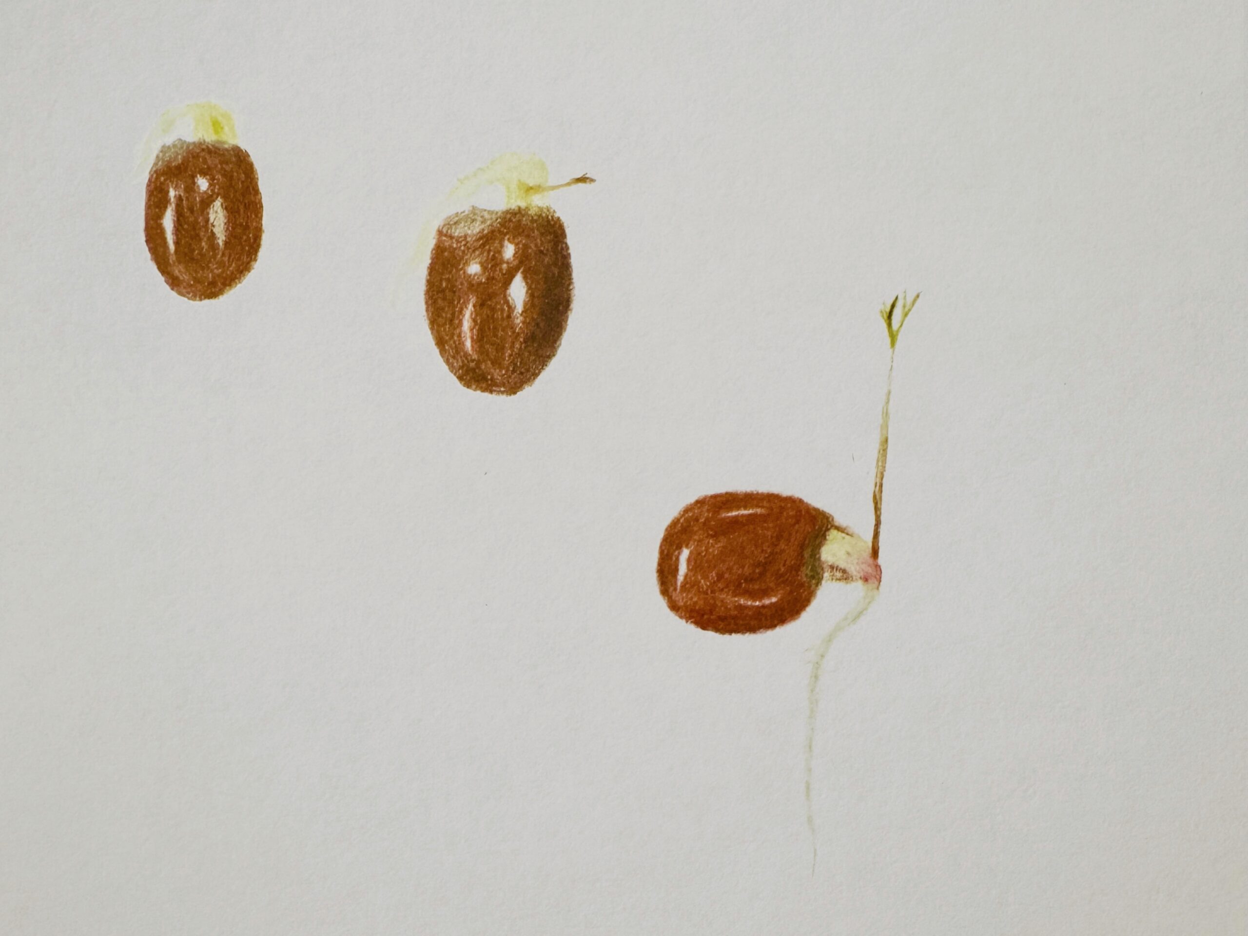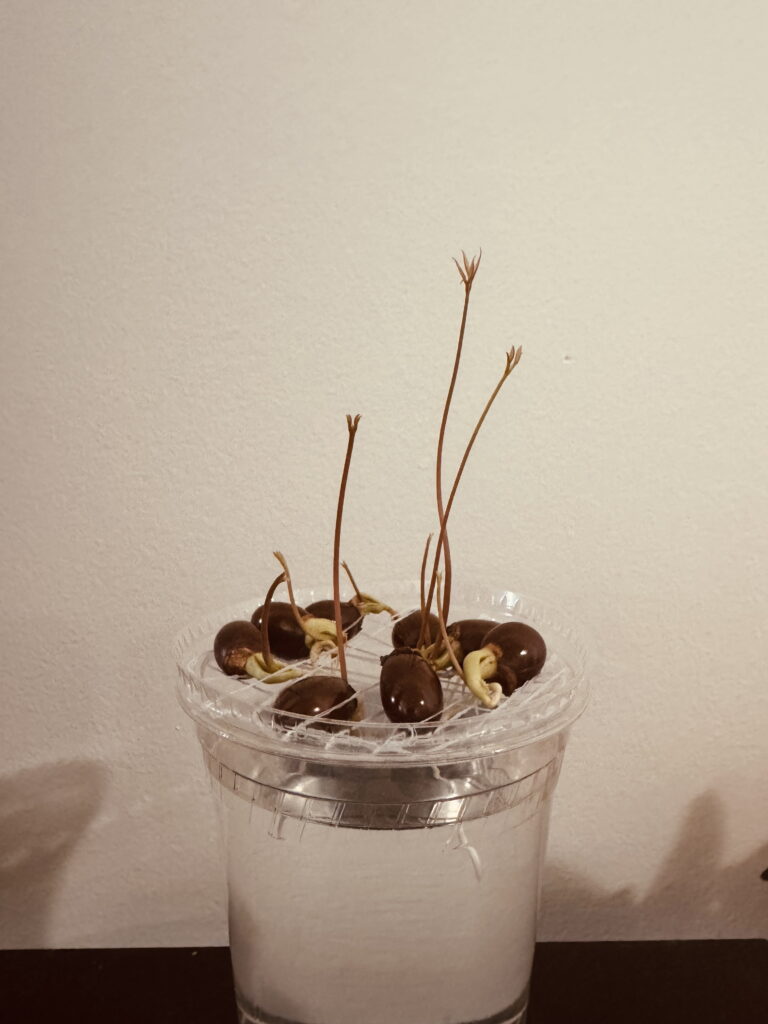 Following their practice, I bought lychees from H Mart and replicated their experiment. After about three days, the pits crack and something starts to grow. I looked up the nomenclature of pit parts and found that it is called the “radicle.” Cultivators often transfer the lychee pits to a box layered with paper towels soaked in water. After another three or four days, a thin white-greenish root starts to extend out of its shell. When they reach one inch long, the pits need to be moved to a place with water. The lychee enthusiasts love to use recycled coffee cups. Usually there should be a net just above the water level so the roots can reach the moisture below without getting the pit damp. After a few days, a tiny sprout comes out of the part connecting the root and first stem—this is its hypocotyl.